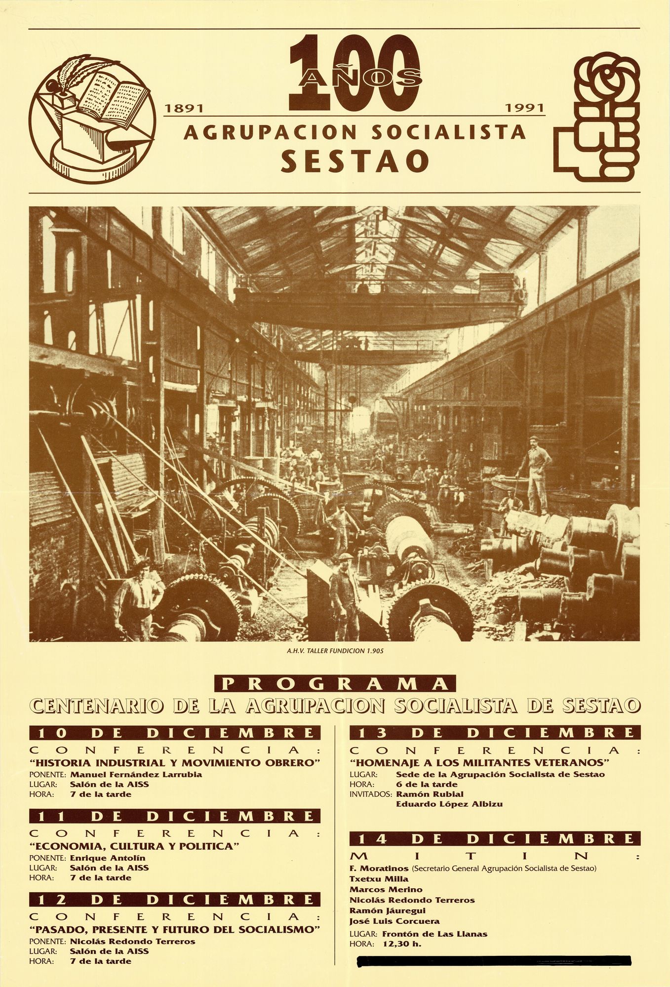 Título: 100 años Agrupación Socialista Sestao [Material gráfico] : 1891-1991 : centenario de la Agrupación Socialista de Sestao : programa : 10 diciembre conferencia, "Historia industrial y movimiento obrero",... 14 de diciembre, mitin, F. Moratinos..