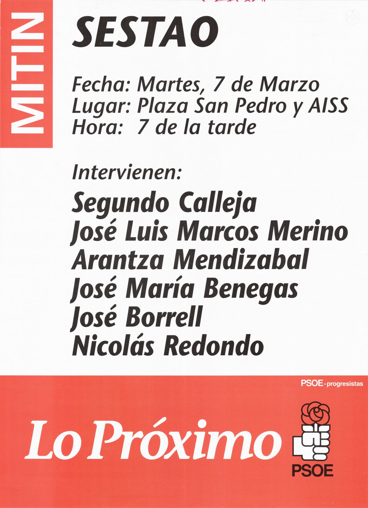 | Título: | Lo próximo PSOE [Material gráfico] : mitin Sestao, fecha, martes, 7 de marzo, lugar, Plaza de San Pedro y AISS, hora, 7 d ela tarde, intervienen, Segundo Calleja,... Nicolás Redondo : PSOE-progresistas |