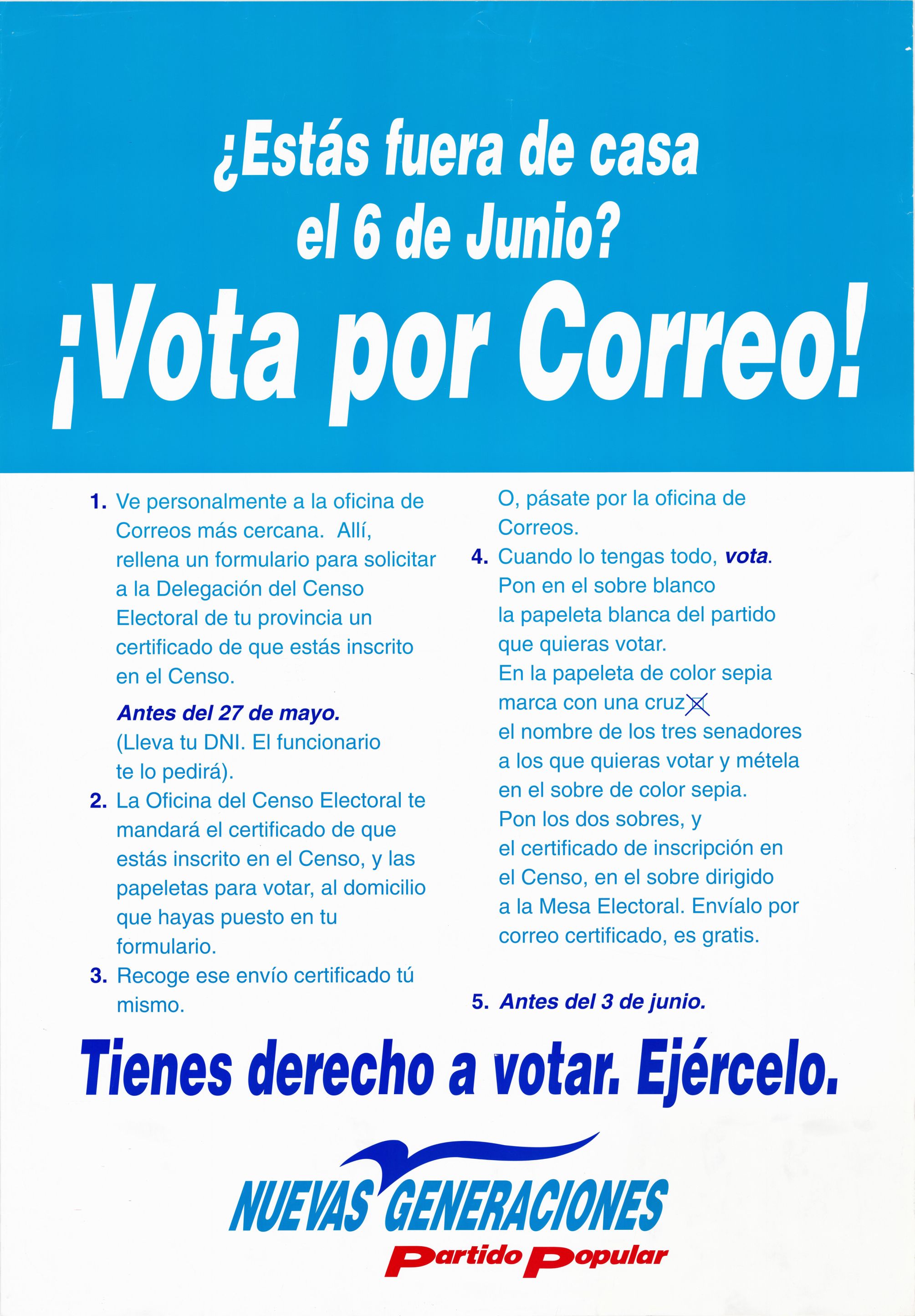 Título: Estás fuera de casa el 6 de junio? [Material gráfico] : ¡vota por correo! : tienes derecho a votar, ejércelo : Nuevas Generaciones, Partido Popular