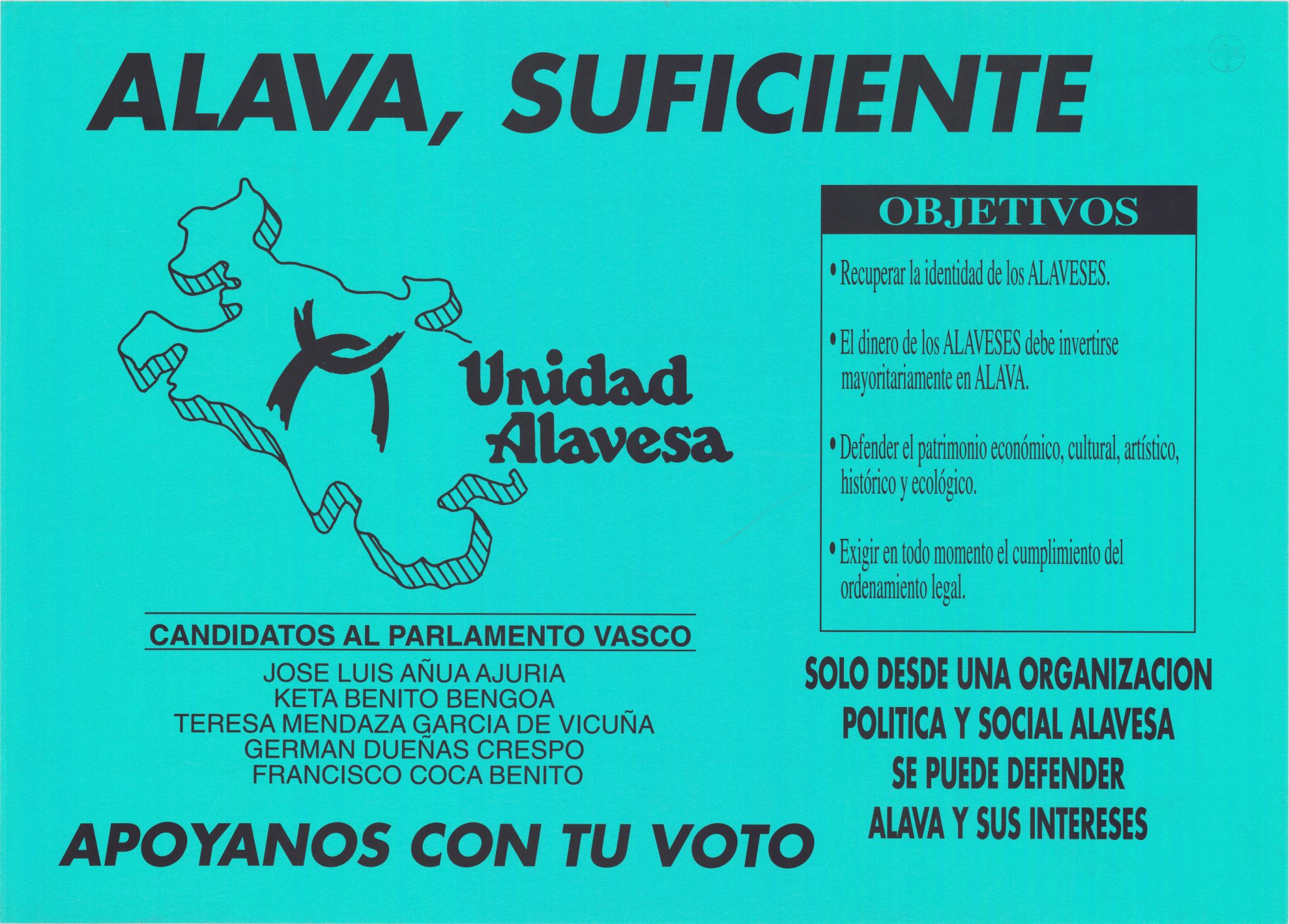 Título: Álava suficiente [Material gráfico] : Unidad Alavesa : ayúdanos con tu voto : candidatos al Parlamento Vasco, José Luis Añua Ajuria... : sólo desde una organización política alavesa..