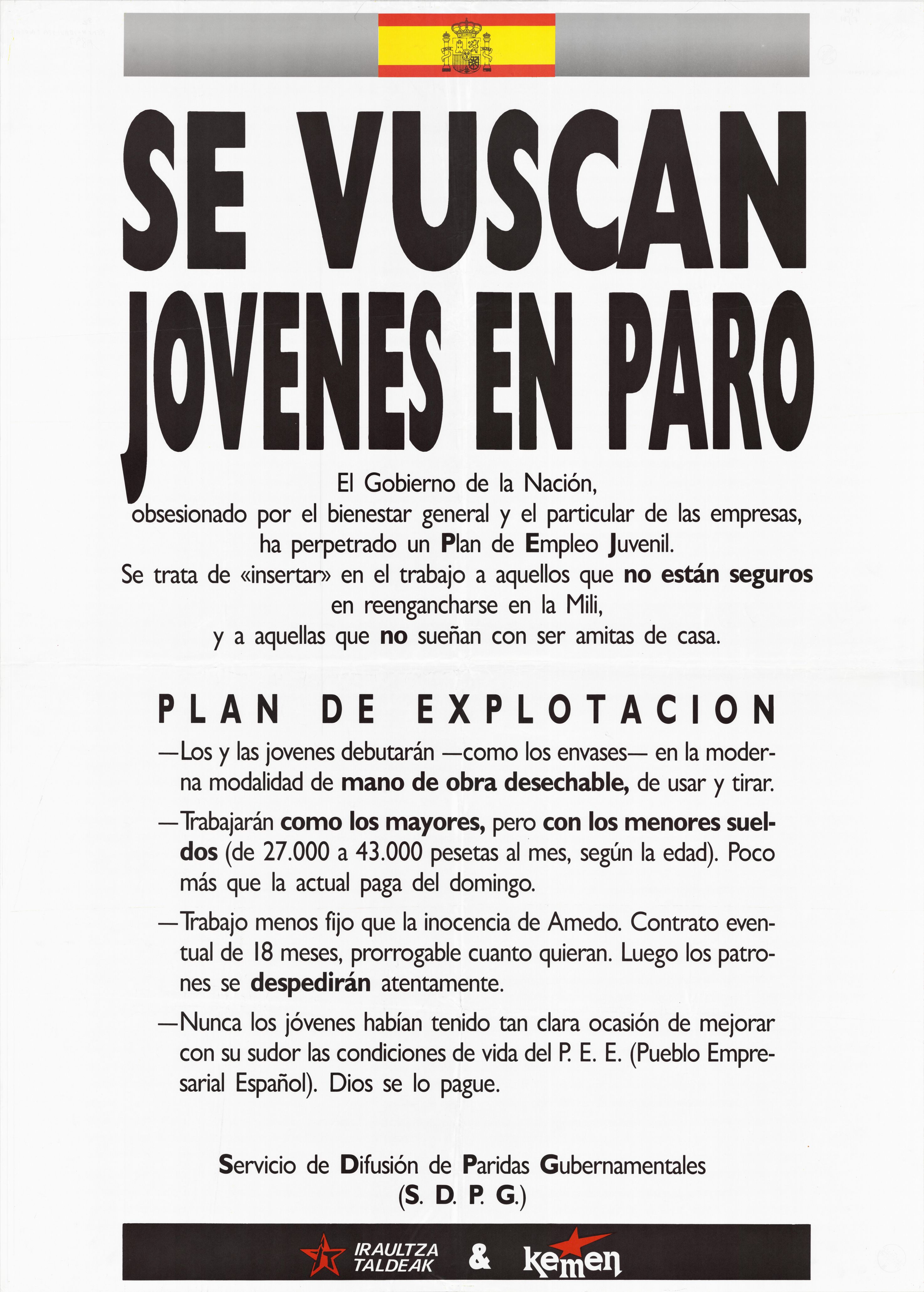 Título: Se vuscan [sic] jóvenes en paro [Material gráfico] : el gobierno de la nación, obsesionado por el bienestar general... : Servicio de Difusión de Paridas Gubernamentales (S.D.P.G.) : Iraultza Taldeak, KEMEN
