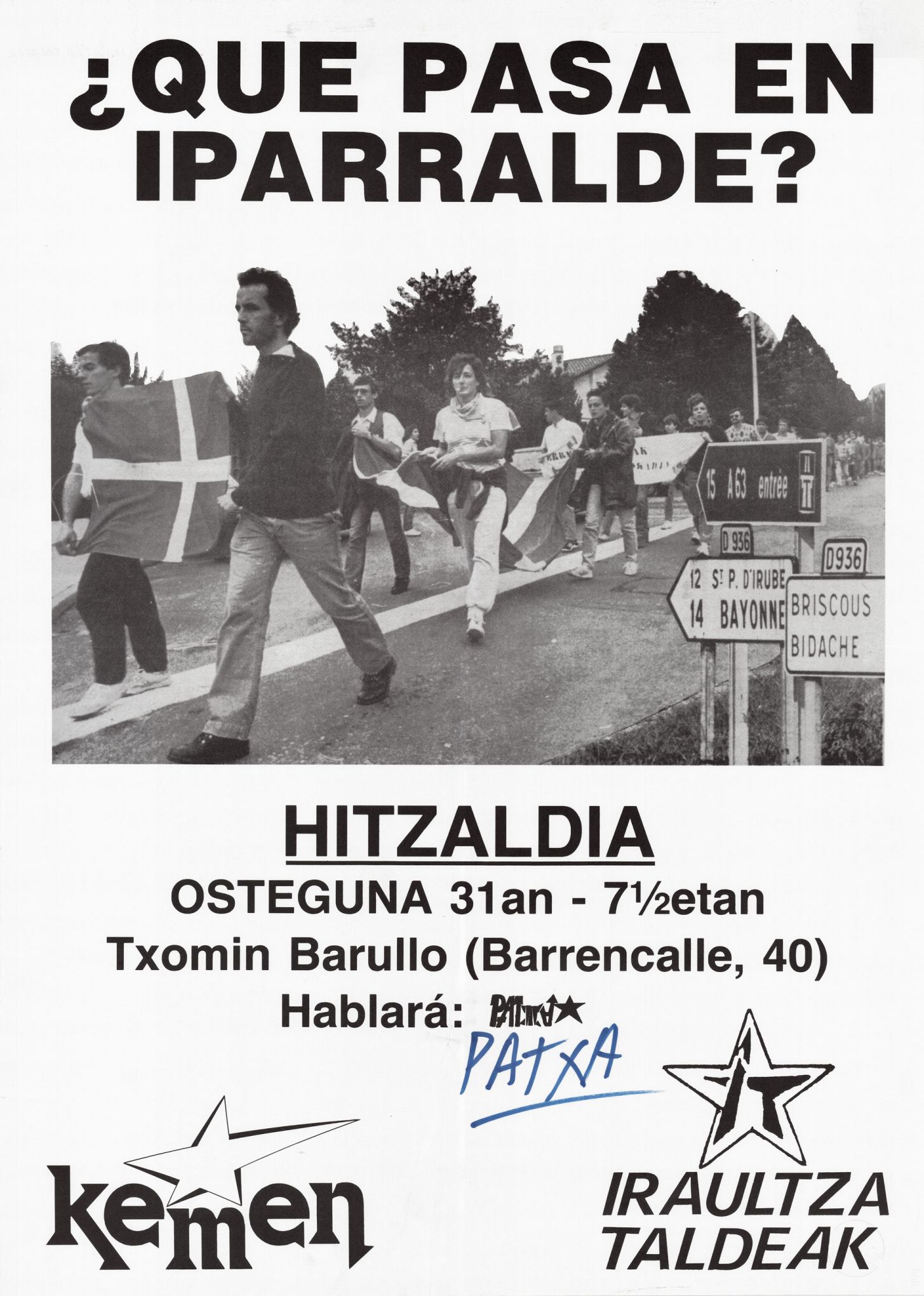 Título: Qué pasa en Iparralde? [Material gráfico] : hitzaldia osteguna 31an - 7 1/2etan Txomin Barullo (Barrencalle, 40), hablará, PATXA : KEMEN, Iraultza Taldeak
