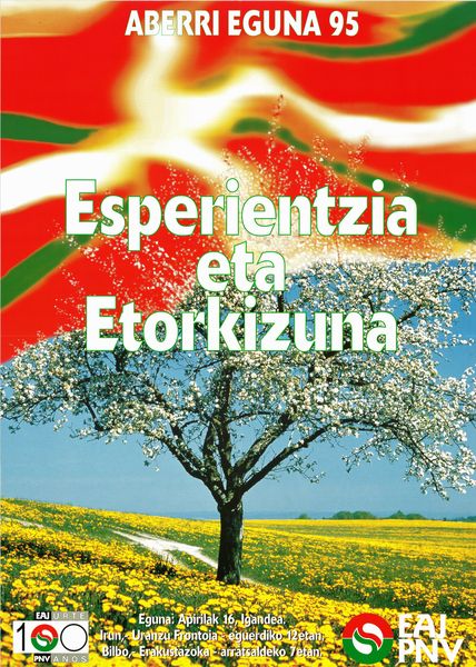 Título: Esperientzia eta etorkizuna [Material gráfico] : Aberri Eguna 95 : eguna, apirilak 16, igandea, Irun, Uranzu Frontoia, eguerdiko 12etan, Bilbo, Erakusketazoka, arratsaldeko 7etan : EAJ 100 urte, PNV 100 años