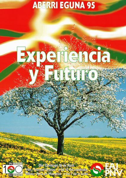 Título: Experiencia y futuro [Material gráfico] : Aberri Eguna 95 : día, domingo 16 de abril, Irún, Frontón Uranzu, a las 12 del mediodía, Bilbao, Feria de Muestras, a las 7 de la tarde : EAJ 100 urte, PNV 100 años