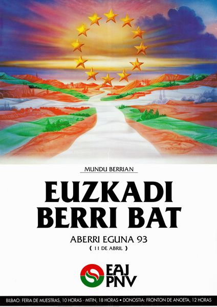 Título: Euzkadi berri bat [Material gráfico] : Aberri Eguna 93 (11 de abril) : EAJ-PNV : Bilbao, Feria de Muestras, 10 horas, mitin, 18 horas, Donostia, Frontón de Anoeta, 12 horas / H.D. Santana