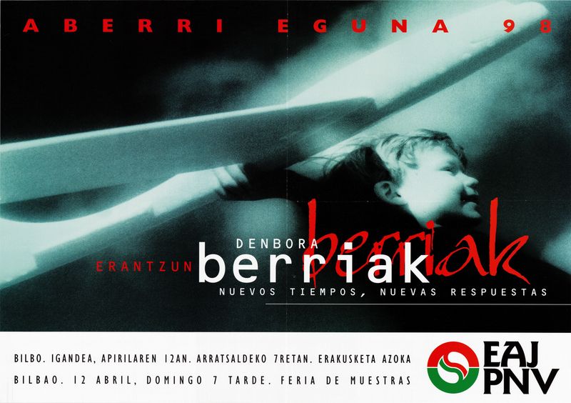 Título: Aberri Eguna 98 [Material gráfico] : denbora berriak, erantzun berriak : Bilbo, igandea, apirilaren 12an, arratsaldeko 7retan, Erakusketa Azoka = nuevos tiempos, nuevas respuestas : Bilbao, 12 abril, domingo 7 tarde, Feria de Muestras : EAJ-PNV