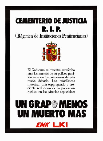 Título: Cementerio de justicia, R.I.P. (Régimen de Instituciones Penitenciarias) [Material gráfico] : el gobierno se muestra satisfecho ante los avances de su política penitenciaria... : un GRAPO menos, un muerto más : EMK, LKI