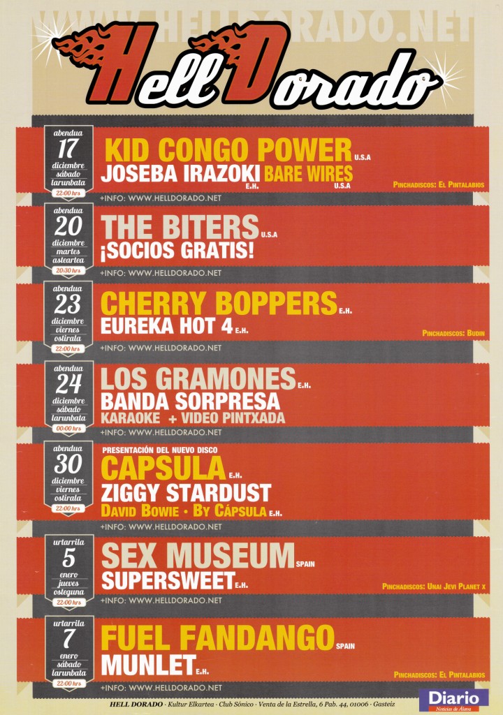 | Título: | Hell Dorado [Material gráfico] : Kid Congo Power, Joseba Irazoki, The Biters; Cherry Boppers, Eureka Hot 4, Los Gramones, Banda Sorpresa, Capsula, Ziggy Stardust, Sex Museum, Supersweet, Fuel Fandango, Munlet / Iñaki Ailaket |
