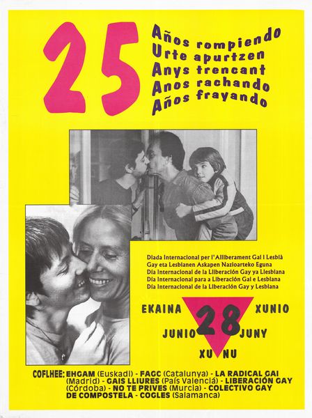 Título: 25 años rompiendo [Material gráfico] : Día Internacional de la Liberación Gay y Lesbiana = Urte apurtzen : Gay eta Lesbianen Askapen Nazioarteko Eguna = Anys trencant : Diada Internacional per l'Alliberament Gay i Lesbià = Anos rachando = Años frayando