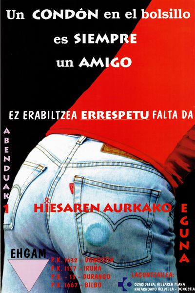 Título: Un condón en el bolsillo es siempre un amigo [Material gráfico] : ez erabiltzea errepetu falta da : HIESaren Aurkako Eguna