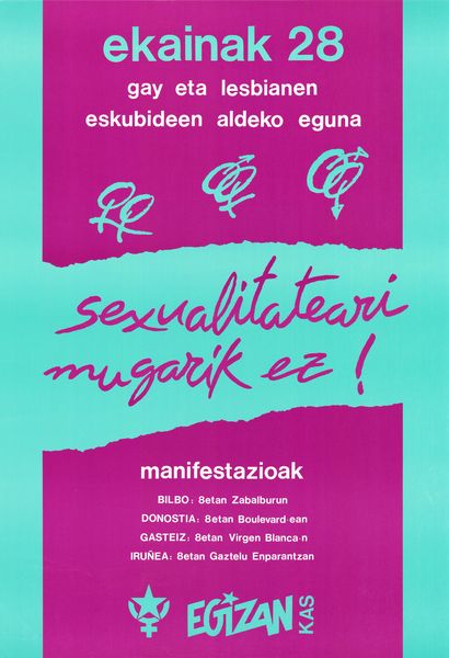 Título: Ekainak 28 [Material gráfico] : Gay eta Lesbianen Eskubideen Aldeko Eguna : sexualitateari mugarik ez! : manifestazioak Bilbo 8etan Zabalburun, Donostia 8etan Boulevard-ean, Gasteiz 8etan Virgen Blanca-n, Iruñea 8etan Gaztelu Enparantzan