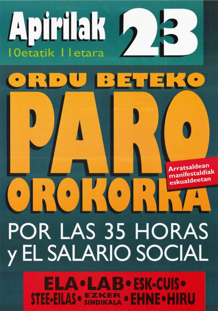 Título: Apirilak 23 [Material gráfico] : 10etatik 11etara : ordu beteko paro orrokorra : por las 35 horas y el salario social
