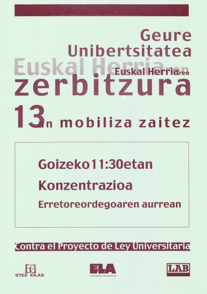 Título: Geure unibertsitatea Euskal Herriaren zerbitzura [Material gráfico] : 13an mobiliza zaitez contra el Proyecto de Ley Universitaria...