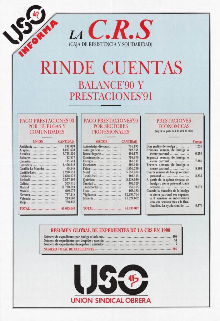 Título: USO informa [Material gráfico] : la C.R.S (Caja de Resistencia y Solidaridad) rinde cuentas : balance '90 y prestaciones 91