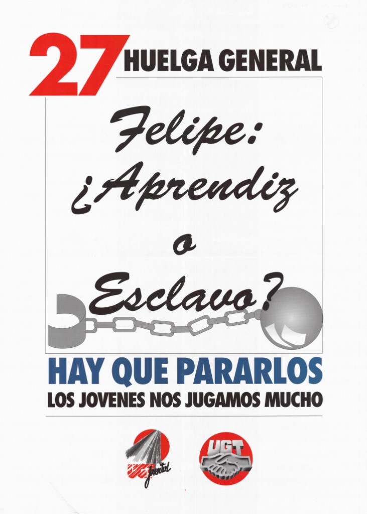 Título: 27 huelga general [Material gráfico] : Felipe, ¿aprendiz o esclavo? : hay que pararlos : los jovenes nos jugamos mucho