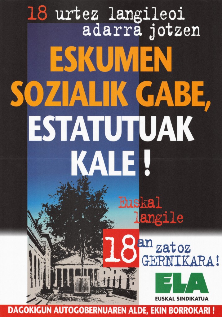 Título: 18 urtez langileoi adarra jotzen, eskumen sozialik gabe [Material gráfico] : Estatutuak kale ! : euskal langile 18an zatoz Gernikara!
