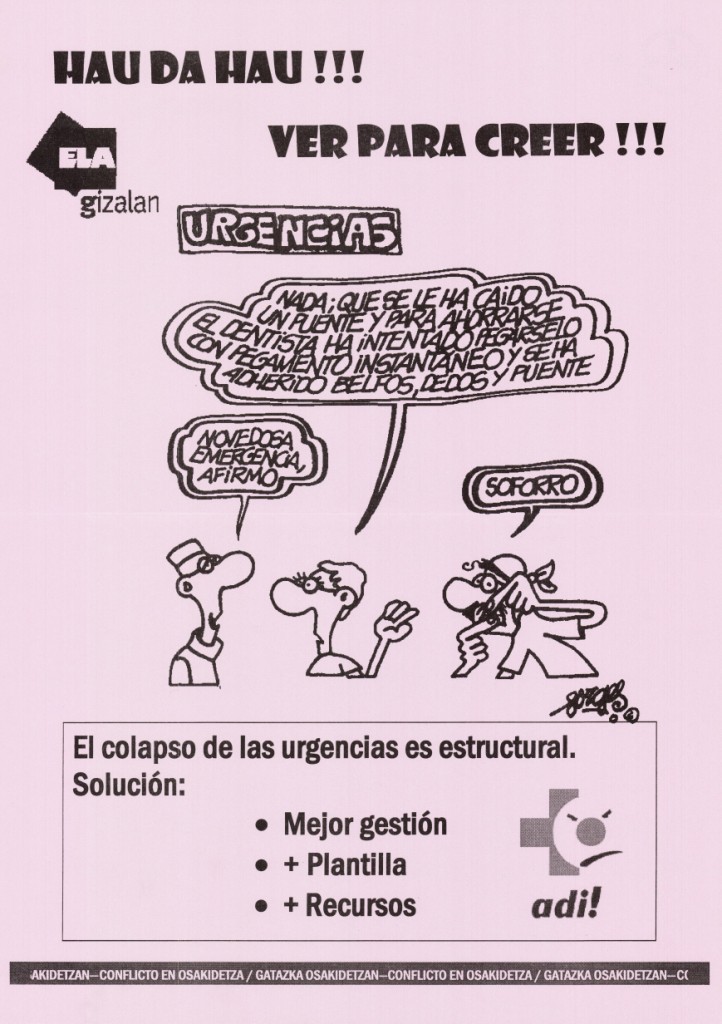 Título: Hau da hau!!! [Material gráfico] = Ver para creer!!! : conflicto en Osakidetza, el colapso de las urgencias es estructural : solución : mejor gestión + plantilla + recursos