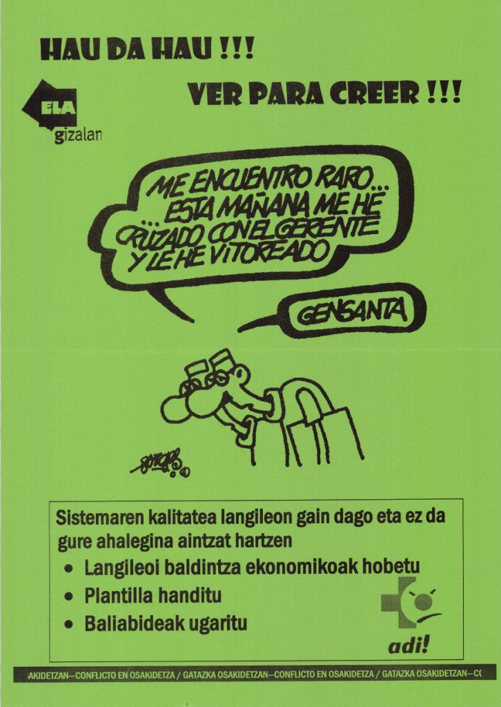 | Título: | Hau da Hau!!! [Material gráfico] = Ver para creer!!! : conflicto en Osakidetza : sistemaren kalitatea langileon gain dago eta ez da gure ahalegina aintzat hartzen : langileoi baldintza ekonomikoak hobetu, plantilla handitu, baliabideak ugaritu |