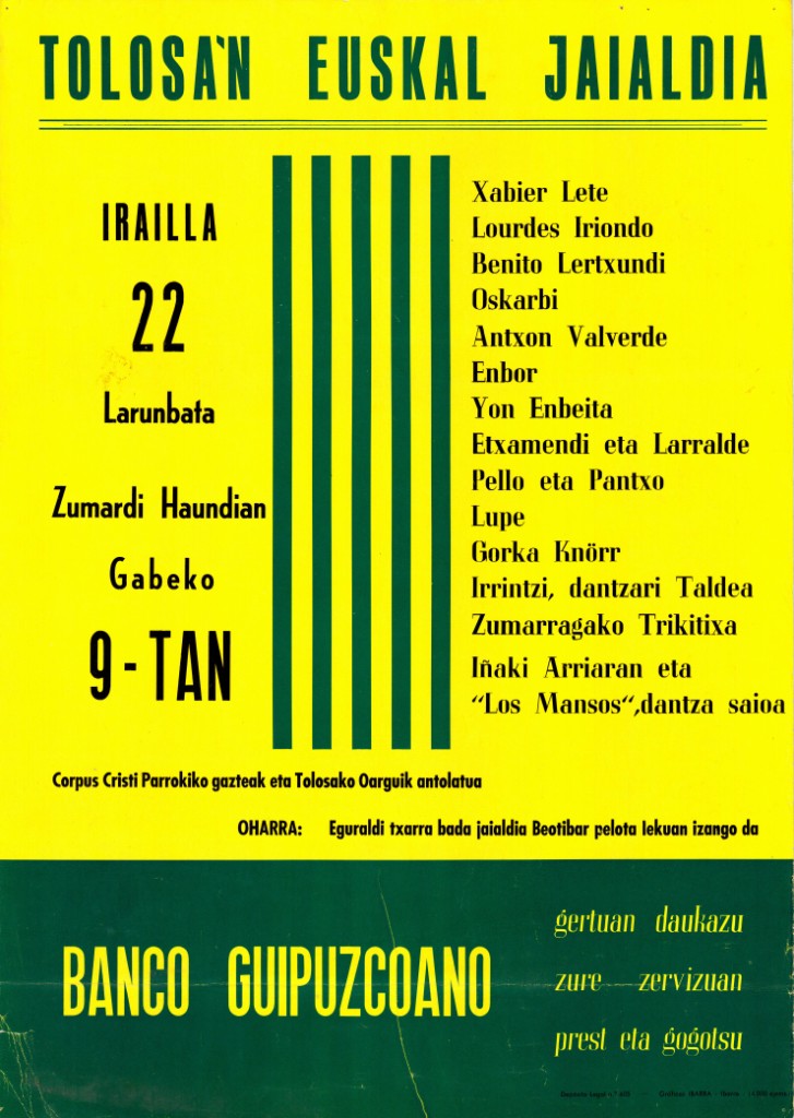 | Título: | Tolosan euskal jaialdian [Material gráfico] : irailla 22 larunbata, Zumardi Haundian gabeko 9-tan : Xabier Lete, Lourdes Iriondo, Benito Lertxundi, Oskarbi, Antxon Valverde, Enbor, Yon Enbeita, Etxamendi eta Larralde, Lupe, Irriti, dantzari taldea, Zumarragako trikitixa, Iñaki Arriaran eta "Los Mansos", dantza saioa : Corpus Cristi parrokiko gazteak eta Tolosako Oarguik antolatua |