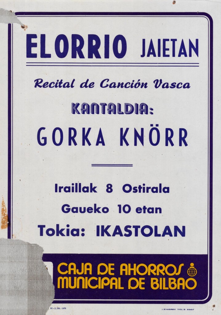 Título: Elorrio jaietan [Material gráfico] : recital de canción vasca : kantaldia, Gorka Knörr : iraillak 8 ostirala gaueko 10 etan : tokia, Ikastolan