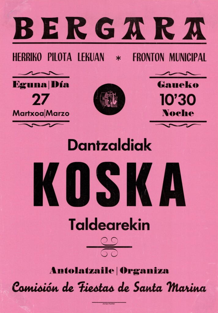 Título: Bergara [Material gráfico] : dantzaldiak Koska taldearekin : herriko pilota lekuan eguna martxoa 27 gaueko 10'30 : antolatzaile Comisión de Fiestas de Santa Marina = frontón municipal día 27 marzo 10'30 noche : organiza Comisión de Fiestas de Santa Marina