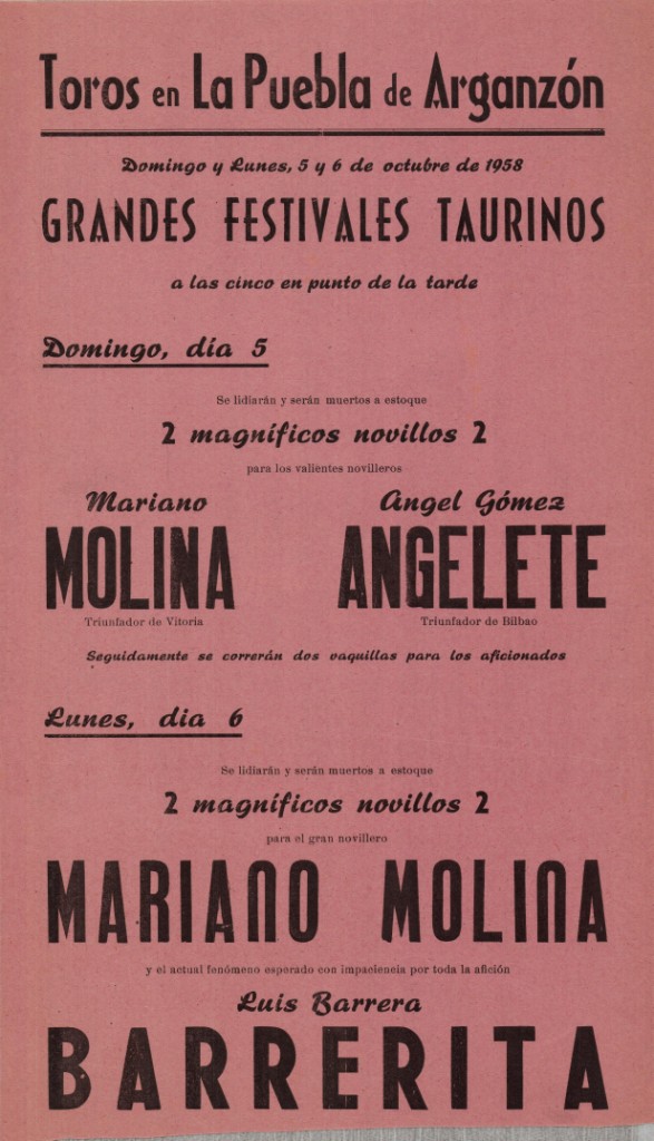Título: Toros en La Puebla de Arganzón [Material gráfico] : grandes festivales taurinos : domingo, día 5 Mariano Molina y Ángel Gómez "Angelete" : lunes, día 6 Mariano Molina y Luis Barrera "Barrerita"