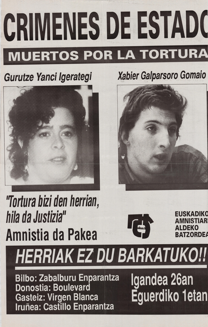 Título: Crímenes de estado [Material gráfico] : muertos por la tortura Gurutze Yanci Igerategi, Xabier Galparsoro Gomaio : herriak ez du barkatuko!! : igandea 26an