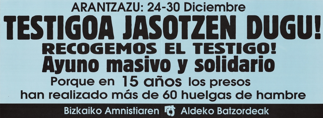 Título: Arantzazu: 24-30 diciembre recogemos el testigo! [Material gráfico] : ayuno masivo y solidario porque en 15 años los presos han realizado más de 60 huelgas de hambre = testigoa jasotzen dugu!