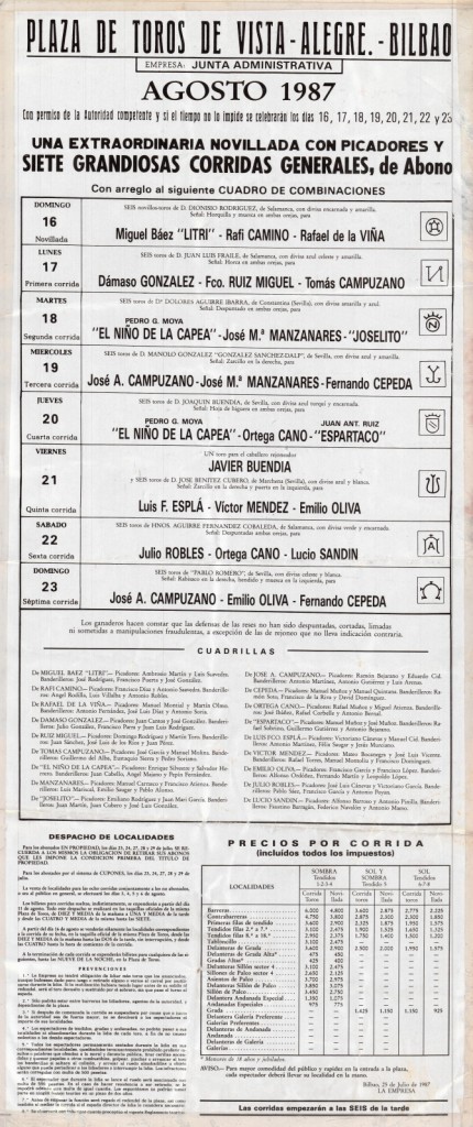 Título: Bilbao 1987 [Material gráfico] :Plaza de Toros de Vista Alegre : una extraordinaria novillada con picadores y 7 grandiosas corridas generales, de abono