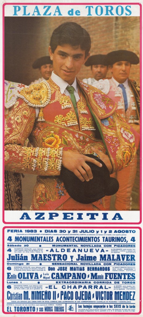 | Título: | Plaza de Toros de Azpeitia [Material gráfico] : feria 1983 : 4 monumentales acontecimientos taurinos Julián Maest, J. Malaver, E. Oliva, L.M. Campano, M. Fuentes, Nimeño II, Paco Ojeda, Víctor Mendez, "Monos toreros" |