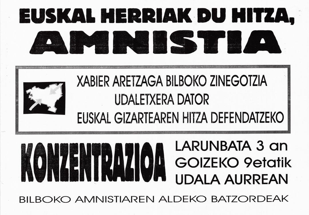 Título: Euskal Herriak du hitza, amnistia [Material gráfico] : Xabier Aretxaga Bilboko zinegotzia udaletxera dator euskal gizartearen hitza defendatzeko kontzentrazioa