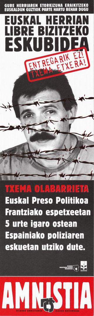 Título: Euskal Herrian libre bizitzeko eskubidea [Material gráfico] : entregarik ez! : Txema etxera! : Txema Olabarrieta euskal preso politikoa Frantziako espetxeetan 5 urte igaro ostean Espainiako poliziaren eskuetan utziko dute : amnistia