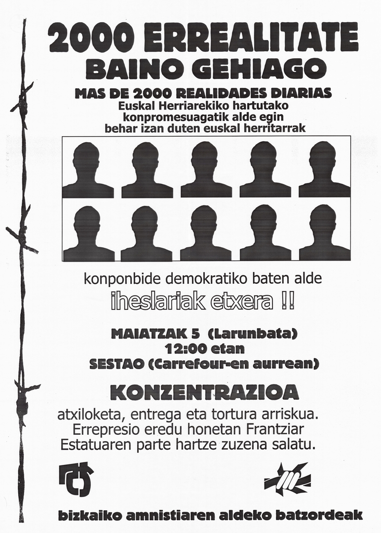 Título: 2000 errealitate baino gehiago [Material gráfico] : más de 2000 realidades diarias : Euskal Herriarekiko hartutako konpromezuagatik alde egin behar izan duten euskal herritarrak : konponbide demokratiko baten alde iheslariak etxera!! : maiatzak 5 (larunbata) 12:00 etan Sestao (Carrefour-en aurrean) konzentrazioa