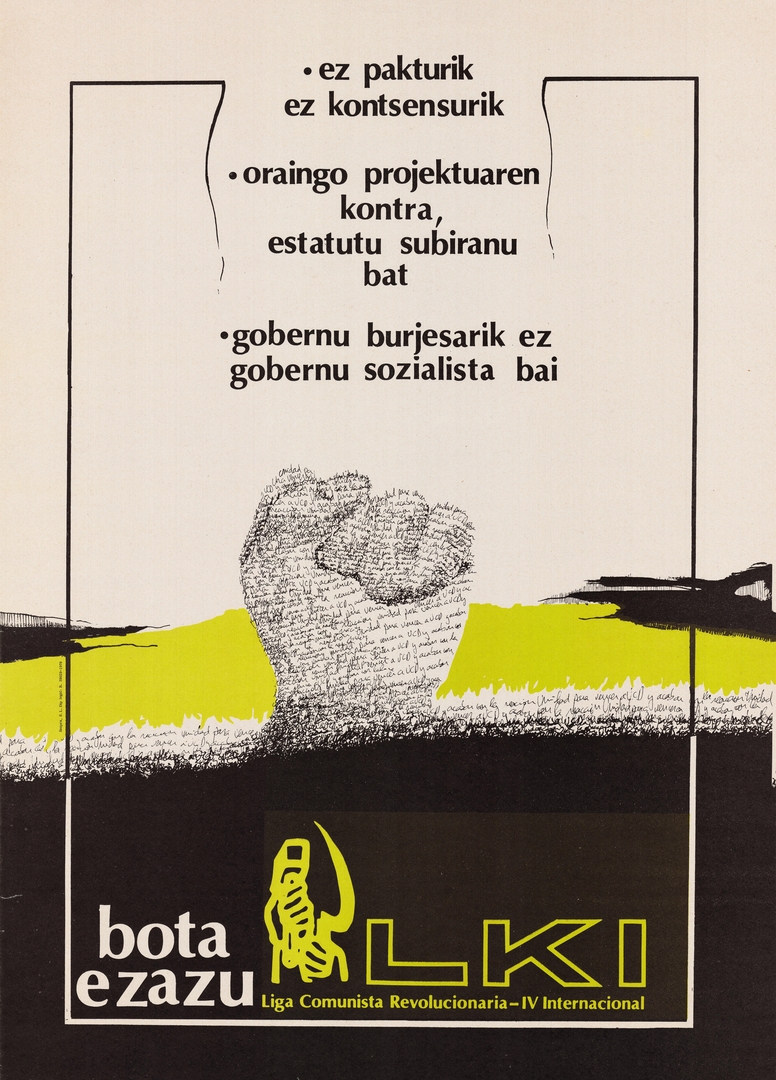 Título: Bota ezazu LKI Liga Comunista Revolucionaria-IV Internacional [Material gráfico] : ez pakturik ez kontsensurik : oraingo projektuaren kontra, estatutu subiranu bat : gobernu burjesarik ez gobernu sozialista bai