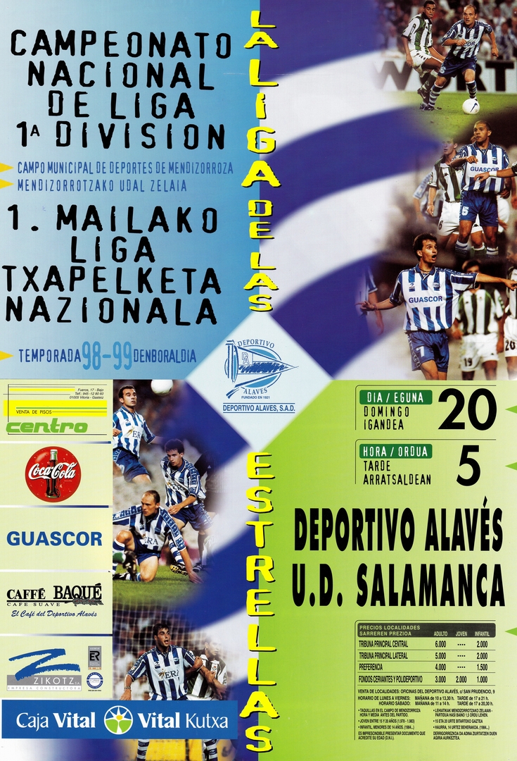 | Título: | Campeonato Nacional de Liga 1a División [Material gráfico] : temporada 98-99 : La Liga de las Estrellas : Deportivo Alavés - U.D. Salamanca : día 20 domingo, hora 5 tarde : Campo Municipal de Deportes de Mendizorroza = 1. Mailako Liga Txapelketa Nazionala : 98-99 denboraldia : eguna igandea 20, ordua 5 arratsaldean : Mendizorrotzako Udal Zelaia |