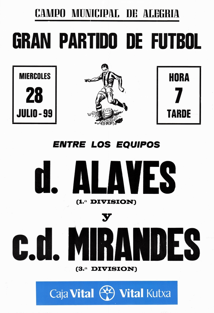 Título: Gran partido de futbol entre los equipos D. Alavés (1a División) y C.D. Mirandés (3a División) [Material gráfico] : Campo Municipal de Alegria : miércoles 28 julio-99, hora 7 tarde