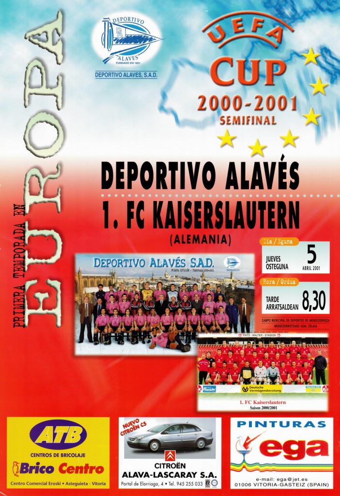 Título: Primera temporada en Europa [Material gráfico] : Deportivo Alavés, S.A.D. : UEFA CUP 2000-2001 semifinal : Deportivo Alavés - 1. FC Kaiserslautern (Alemania) : dia jueves 5 abril 2001, hora 8,30 tarde = eguna osteguna 5, ordua 8,30 arratsaldean