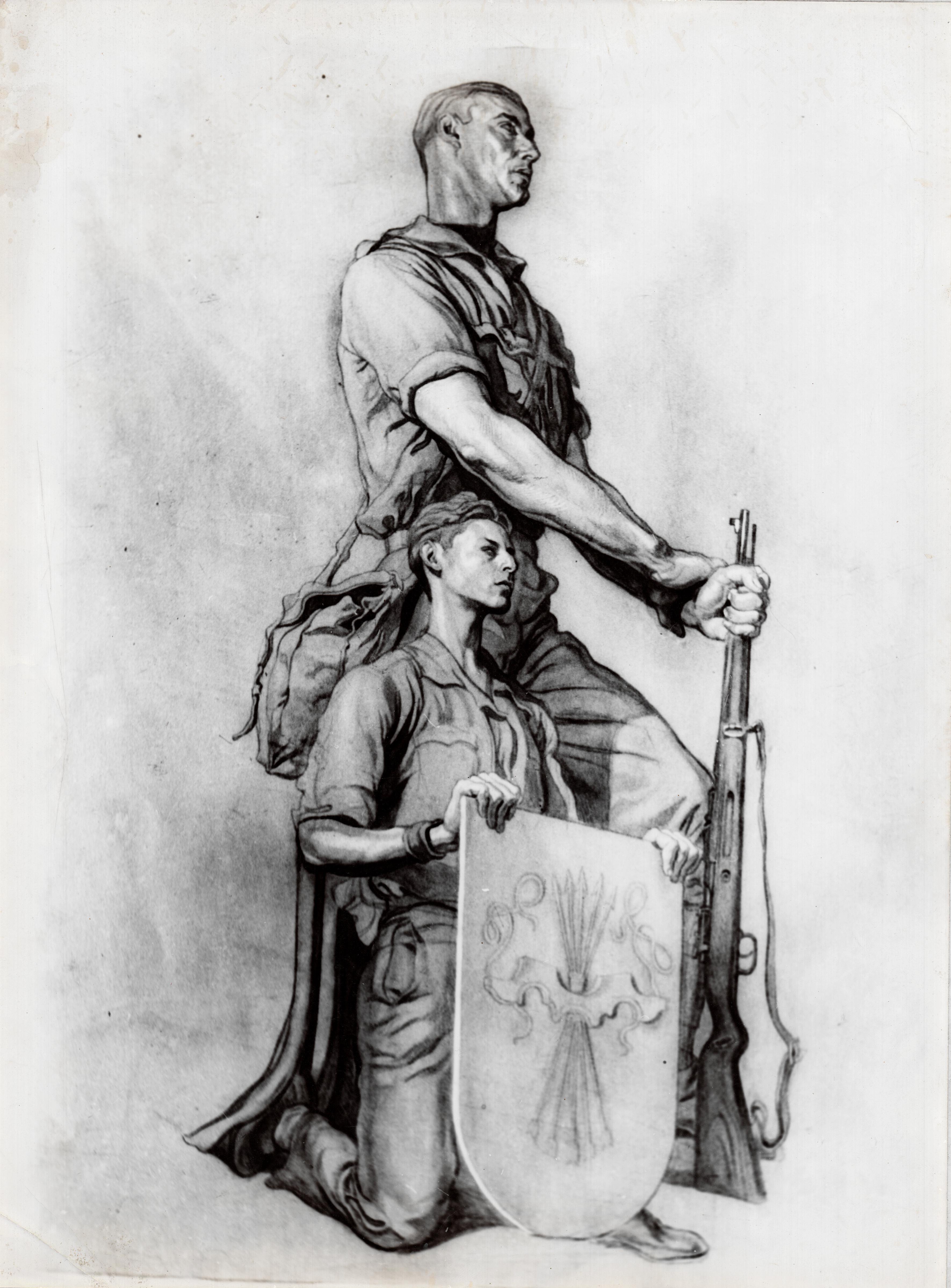Resumen: Fotografía de un dibujo de Carlos Sáenz de Tejada de un falangista con su hijo sosteniendo un escudo de Falange. Reverso inscripción: Encabezamiento “La Falange” reproducción fotográfica de un dibujo utilizado para una ilustración del Diario “Ávila”. Propiedad de Carlos Sáenz de Tejada. Madrid 29 de junio de 1961.