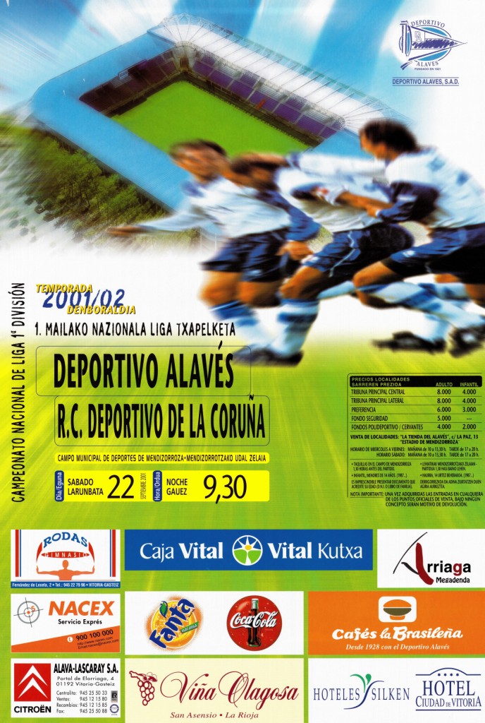 | Título: | Campeonato Nacional de Liga 1a División [Material gráfico] : temporada 2001-2002 : Deportivo Alavés - R.C. Deportivo de La Coruña : sábado día 22 septiembre 2001, hora 9,30 noche : Campo Municipal de Deportes de Mendizorroza = 1. Mailako Nazionala Liga Txapelketa : 2001-2002 denboraldia : eguna larunbata 22, ordua 9,30 gauez : Mendizorrotzako Udal Zelaia |