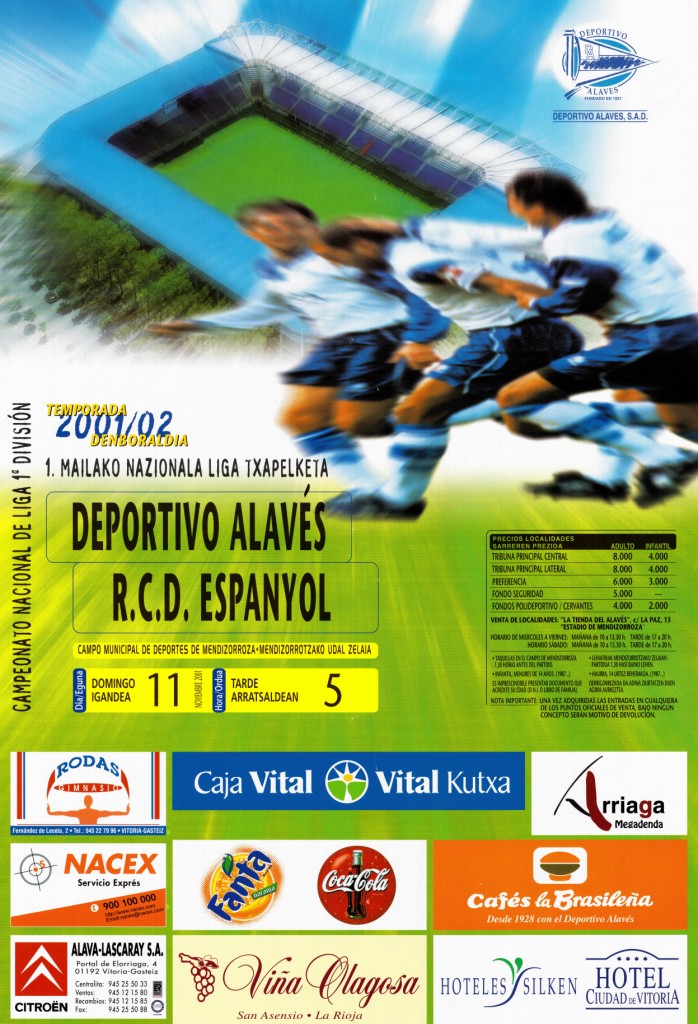 | Título: | Campeonato Nacional de Liga 1a División [Material gráfico] : temporada 2001-2002 : Deportivo Alavés - R.C.D. Espanyol : domingo día 11 noviembre 2001, hora 5 tarde : Campo Municipal de Deportes de Mendizorroza = 1. Mailako Nazionala Liga Txapelketa : 2001-2002 denboraldia : eguna igandea 11, ordua 5 arratsaldean : Mendizorrotzako Udal Zelaia |