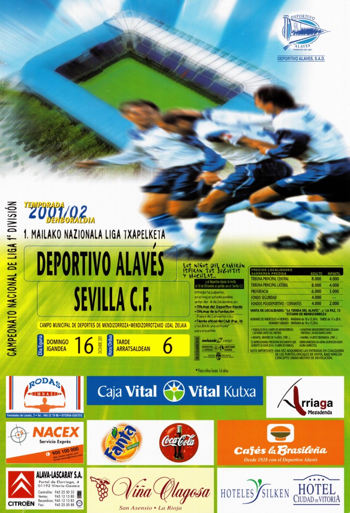 | Título: | Campeonato Nacional de Liga 1a División [Material gráfico] : temporada 2001-2002 : Deportivo Alavés - Sevilla C.F. : domingo día 16 diciembre 2001, hora 6 tarde : Campo Municipal de Deportes de Mendizorroza = 1. Mailako Nazionala Liga Txapelketa : 2001-2002 denboraldia : eguna igandea 16, ordua 6 arratsaldean : Mendizorrotzako Udal Zelaia |