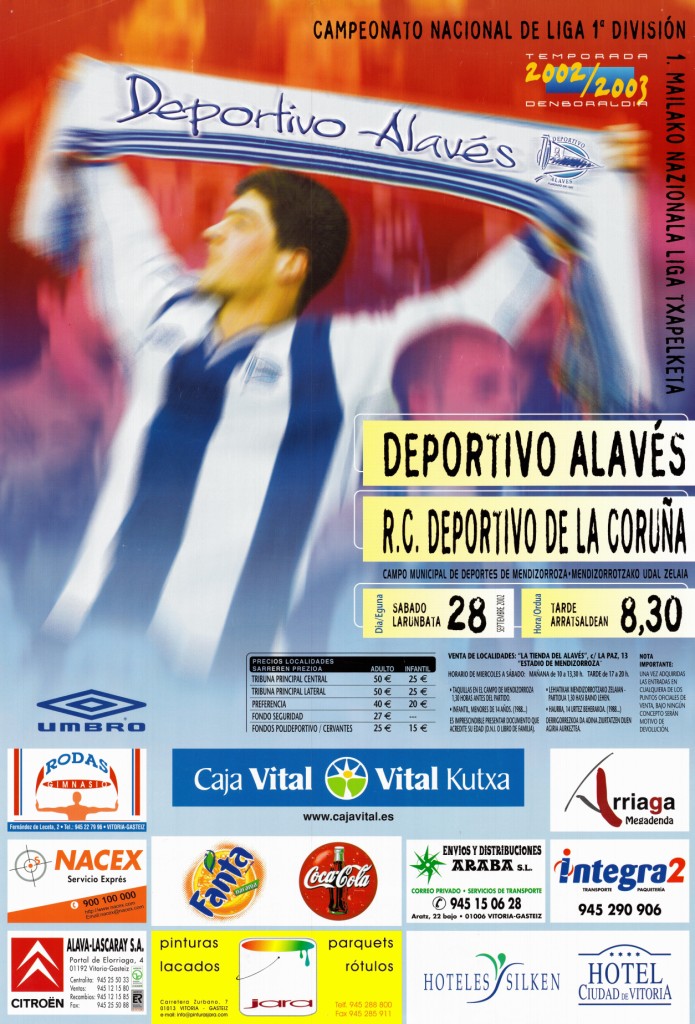 | Título: | Deportivo Alavés [Material gráfico] : Campeonato Nacional de Liga 1a División temporada 2002-2003 : Deportivo Alavés - R.C. Deportivo de La Coruña : sábado día 28 septiembre 2001, hora 8,30 noche : Campo Municipal de Deportes de Mendizorroza = 1. Mailako Nazionala Liga Txapelketa : 2002-2003 denboraldia : eguna larunbata 28, ordua 8,30 gauez : Mendizorrotzako Udal Zelaia |