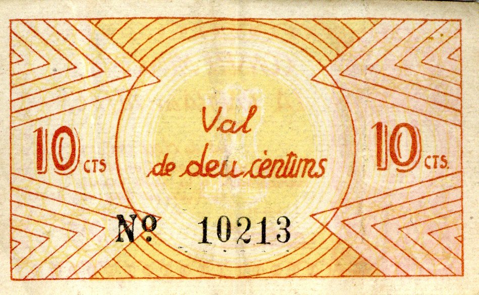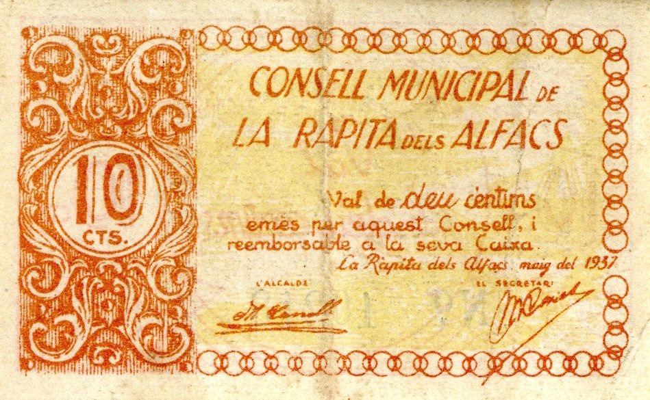 Resumen: Vale de 10 céntimos emitido por el Consell Municipal de La Rapita dels Alfacs, en mayo de 1937. Nº serie: 10213.