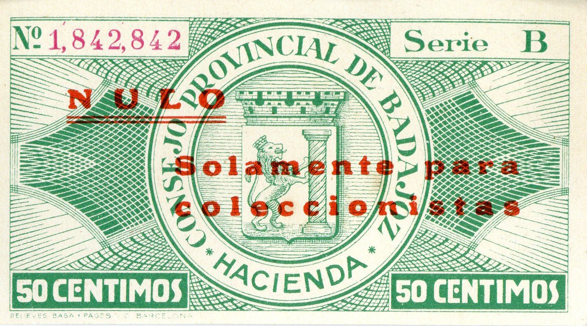 | Resumen: | Bono de 50 céntimos emitido por el Consejo Provincial de Badajoz, en Castuera (Badajoz), 1 octubre 1937. Nº serie: 1,842,842. Serie B.
