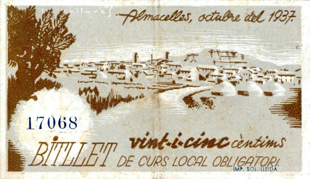Resumen: Vale de 25 céntimos emitido por el Ajuntament de Almacelles en octubre de 1937. Nº serie: 17068. En el reverso: billet de curs local obligatori.