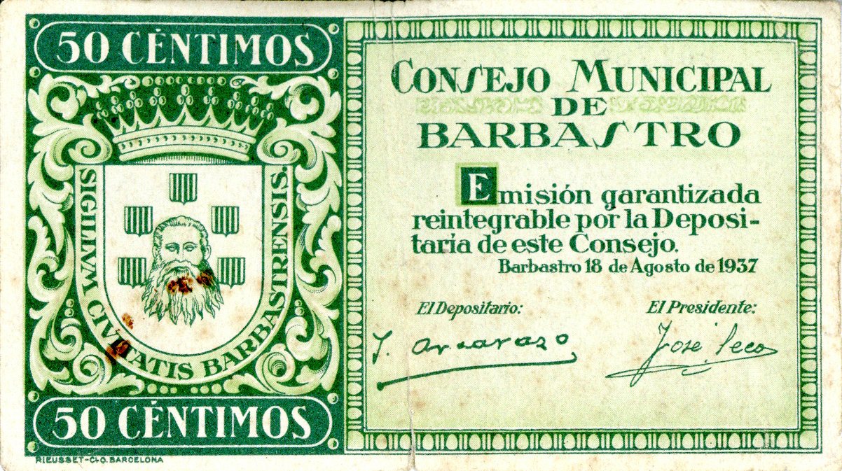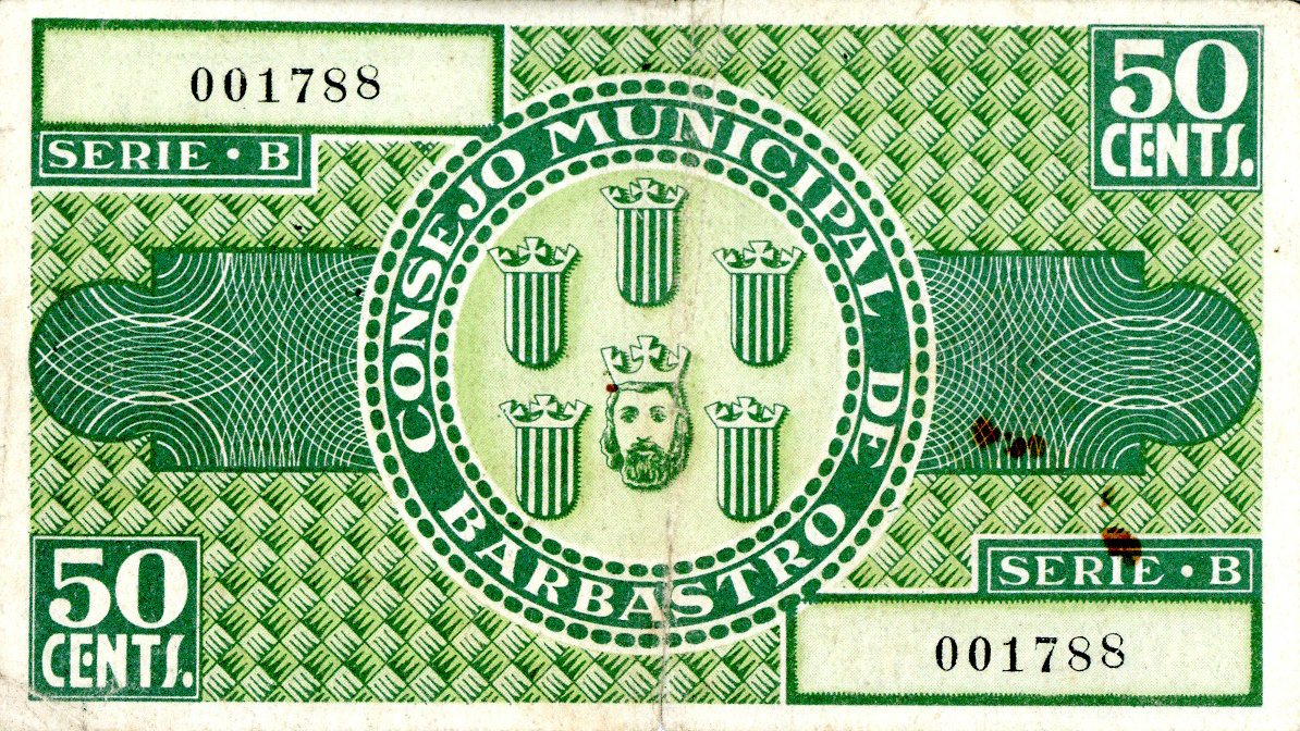 Resumen: Billete emitido por el Consejo Municipal de Barbastro el 18 de agosto de 1937. Nº serie: 001788 Serie B.