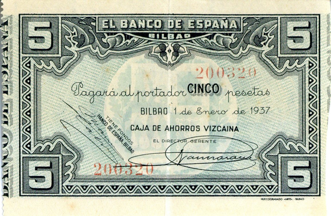 | Resumen: | Billete de cinco pesetas emitido en Bilbao, a 1 de enero de 1937, librado por la Caja de Ahorros Vizcaina, con la autorización del Banco de España en Bilbao por orden del Gobierno de Euzkadi.