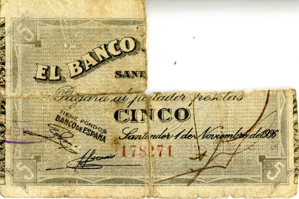 Este talón-billete de 5 pesetas fue emitido por la sucursal del Banco de España de Santander el 1 de noviembre de 1936. Con los escudos de España y Santander en el reverso. Nº serie: 178271. Le falta un trozo. |
