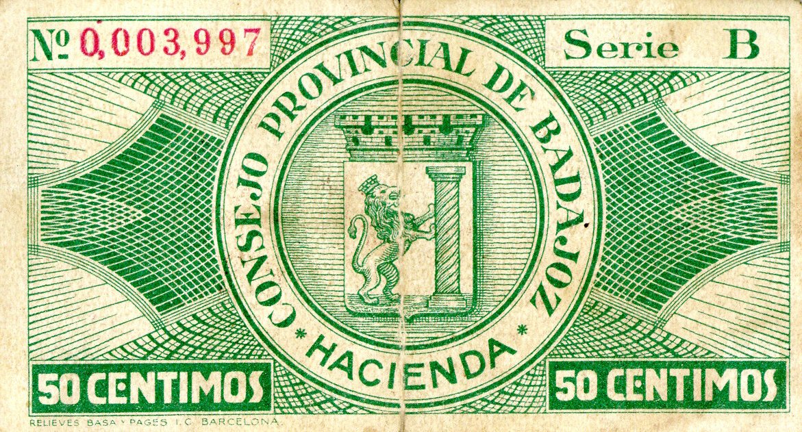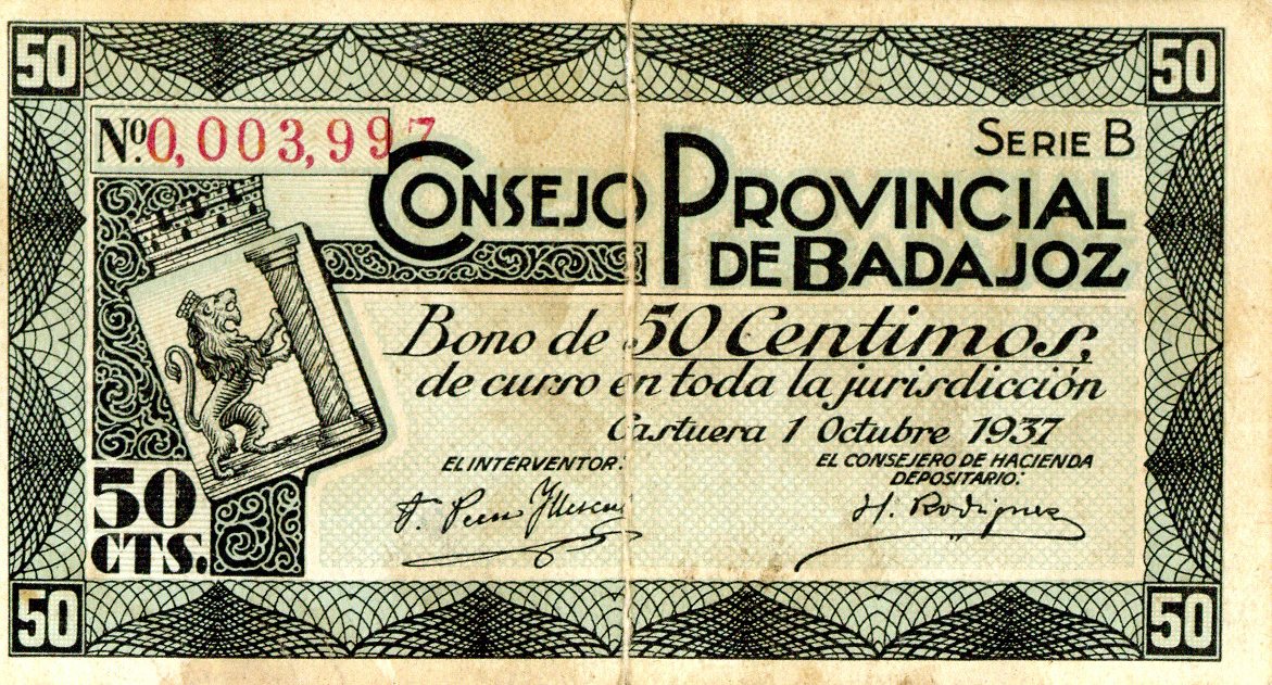 Resumen: Bono emitido en Castuera por el Consejo Provincial de Badajoz. 50 céntimos. 1937. Nº serie: 0,003,997 Serie B.