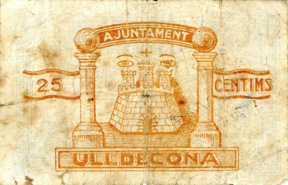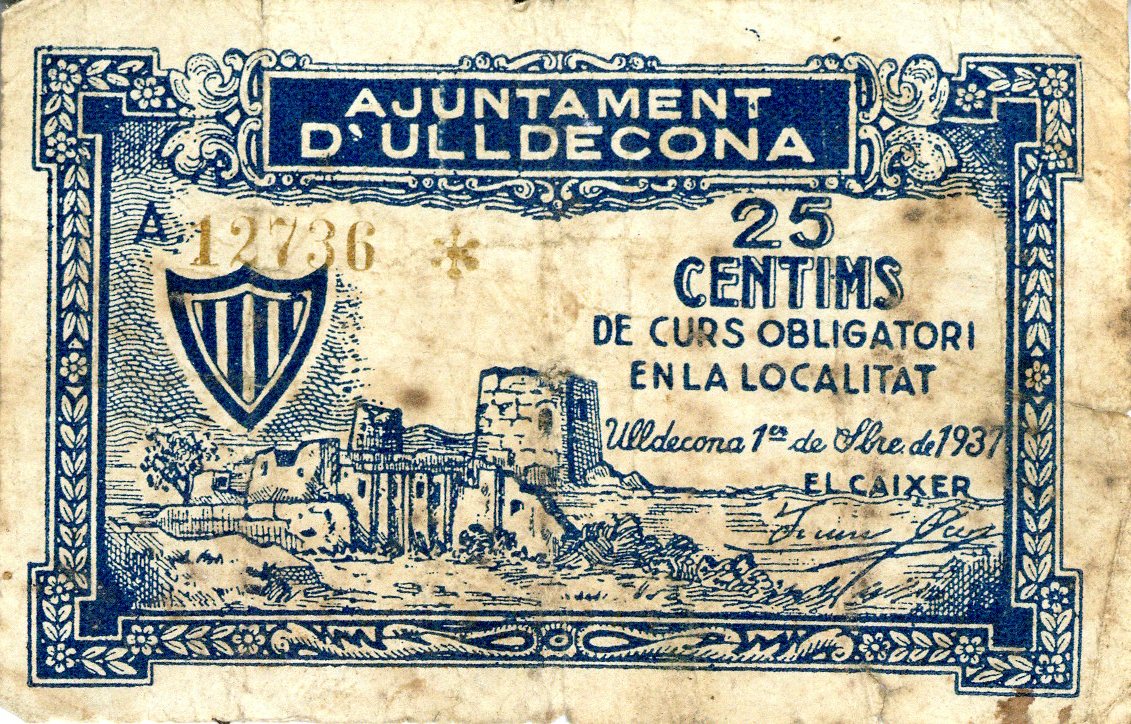 Resumen: Billete emitido por el Ajuntament D´Ulldecona. 25 céntimos. 1937. Nº serie: A 12736.